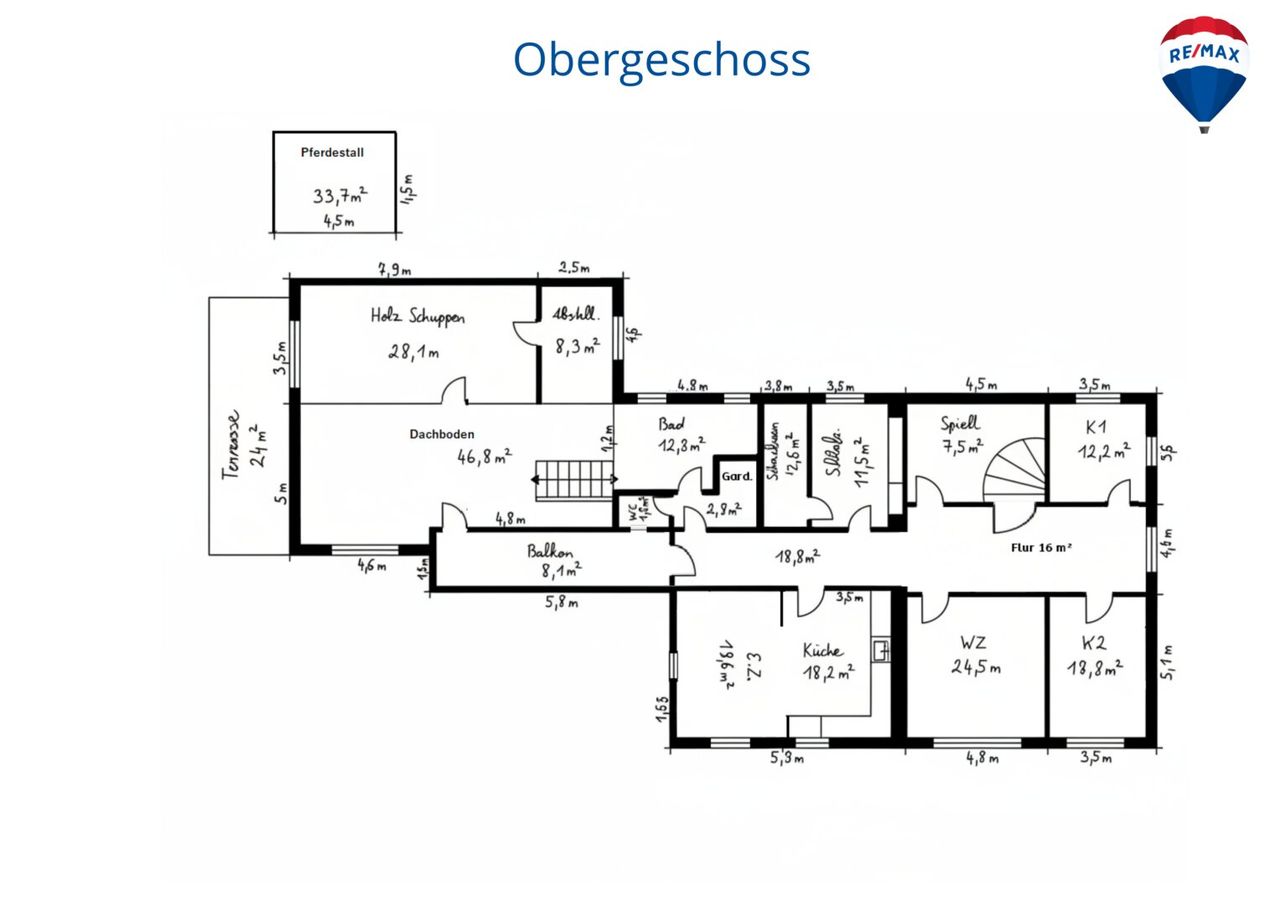 Das Wohnhaus bietet eine Wohnfläche von ca. 305 m², 8 Zimmern, verteilt auf zwei vollständig nutzbare Wohneinheiten. Zusätzlich steht ein Kellerraum mit ca. 37 m² und ein Dachboden mit ca. 192 m² zur Verfügung. Eine Terrasse und ein Balkon erweitern den Wohnraum ins Freie und bieten einen herrlichen Blick in die Natur.