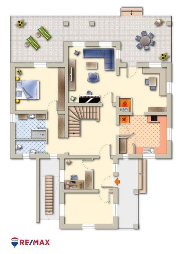 Großzügige Raumaufteilung mit mehreren Schlafzimmern, Wohnküche, Badezimmern und Nebenräumen.