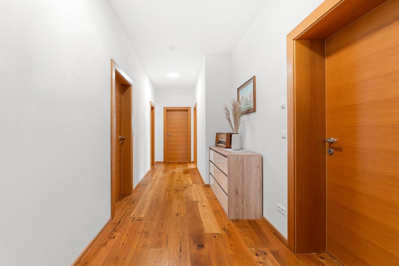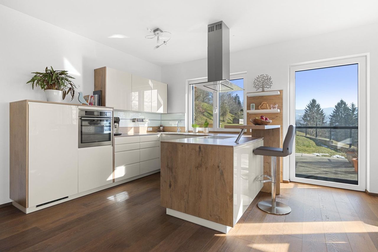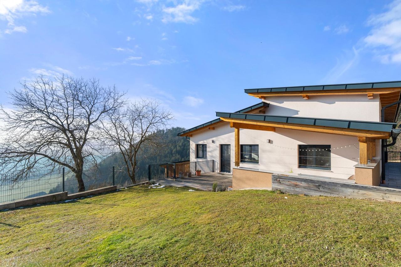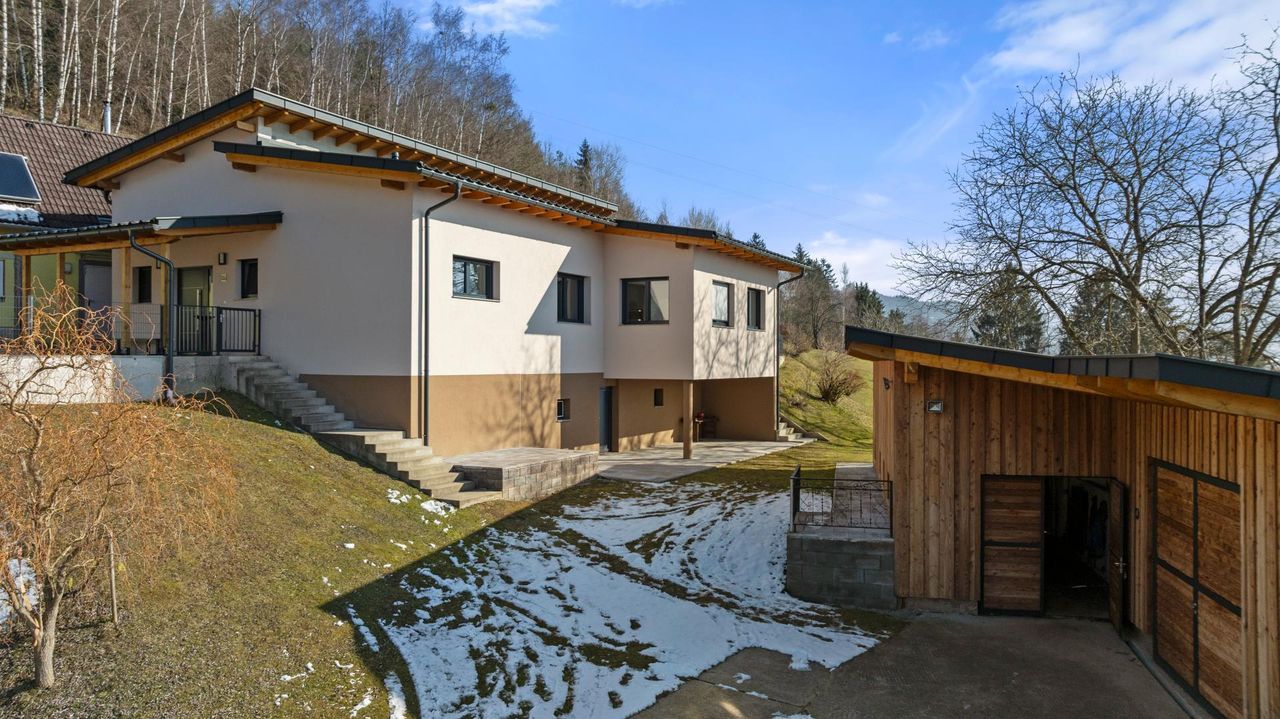 Die Immobilie ist exklusiv und modern möbliert. Das Haus ist ausgestattet mit hochwertigen Internorm-Fenstern mit 3-fach-Verglasung, elektrischen Jalousien und Insektenschutz. Zwei Tageslichtspots im Flur sorgen für angenehmes Licht. Beheizt wird das Haus mittels einer Pellets-Zentralheizung und die installierten Raumthermostate ermöglichen eine perfekte Regulierung des Raumklimas. Zur Warmwasseraufbereitung wurde eine Solaranlage errichtet. Große Fensterfronten holen die Natur ins Haus und eröffnen einen unvergleichlichen Blick auf die umliegende Landschaft. Das Badezimmer ist mit Badewanne und barrierefreier Dusche ausgestattet. Eine teilüberdachte Terrasse mit ca. 48,74 m² schafft einen perfekten Wohlfühlort umgeben von herrlicher Natur.