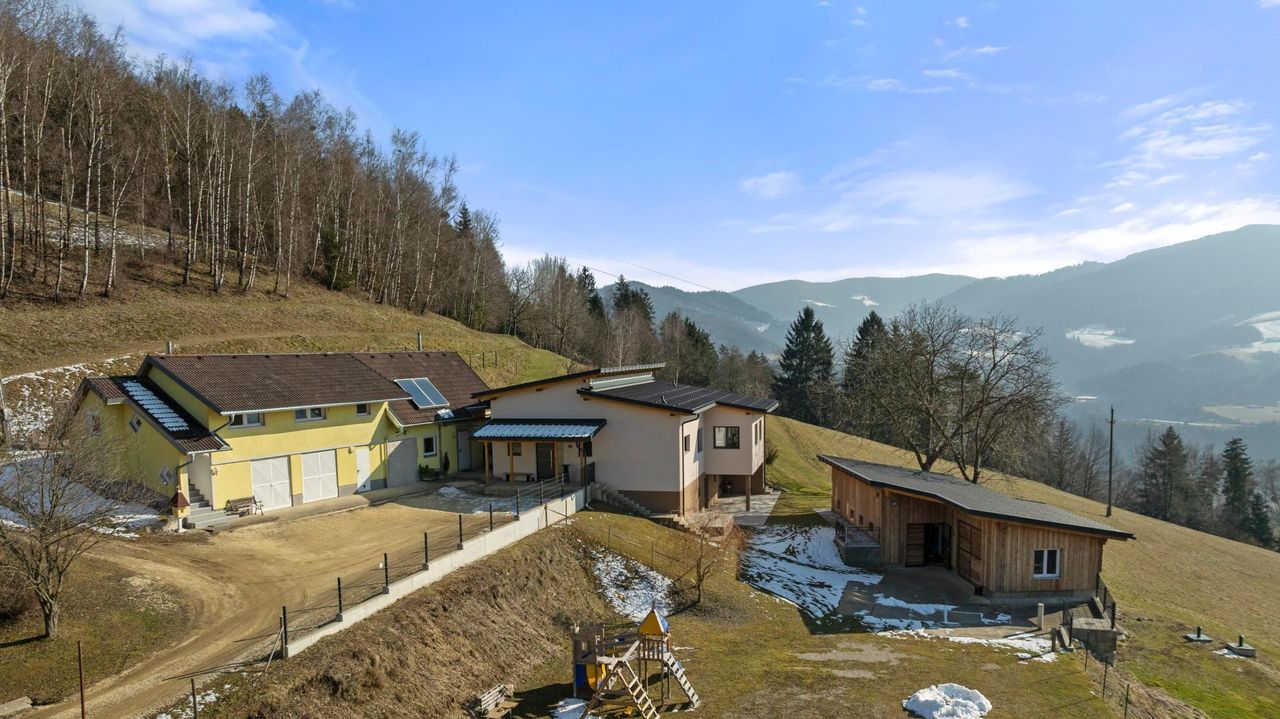 Herrliches Anwesen in traumhafter Alleinlage: Landwirtschaft mit modernem Wohnhaus und vielseitigen Nutzungsmöglichkeiten Auf einer Seehöhe von ca. 551 m – eingebettet in eine malerische Landschaft aus Wiesen, Wäldern und Bergen – bietet dieses außergewöhnliche Anwesen auf ca. 132.334 m² Fläche eine seltene Gelegenheit für alle, die sich Ruhe, Naturverbundenheit und modernen Wohnkomfort wünschen. Das Grundstück ist eine arrondierte, zusammenhängende Fläche mit eigener Zufahrt – ein wahres Paradies für Selbstversorger, Pferde- und Naturliebhaber. Das Wohnhaus wurde ca. 2016 erweitert und kernsaniert und bietet auf einer Wohnfläche von ca. 125,45 m² auf einer Ebene exklusiven Flair und ein durchdachtes Raumkonzept. Die Wohnfläche...
