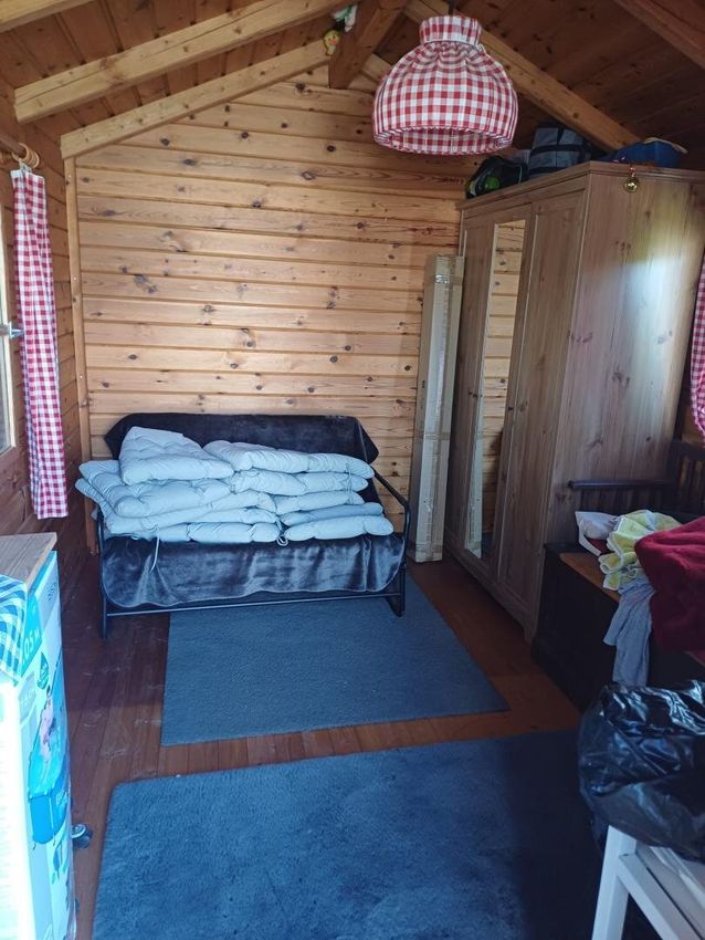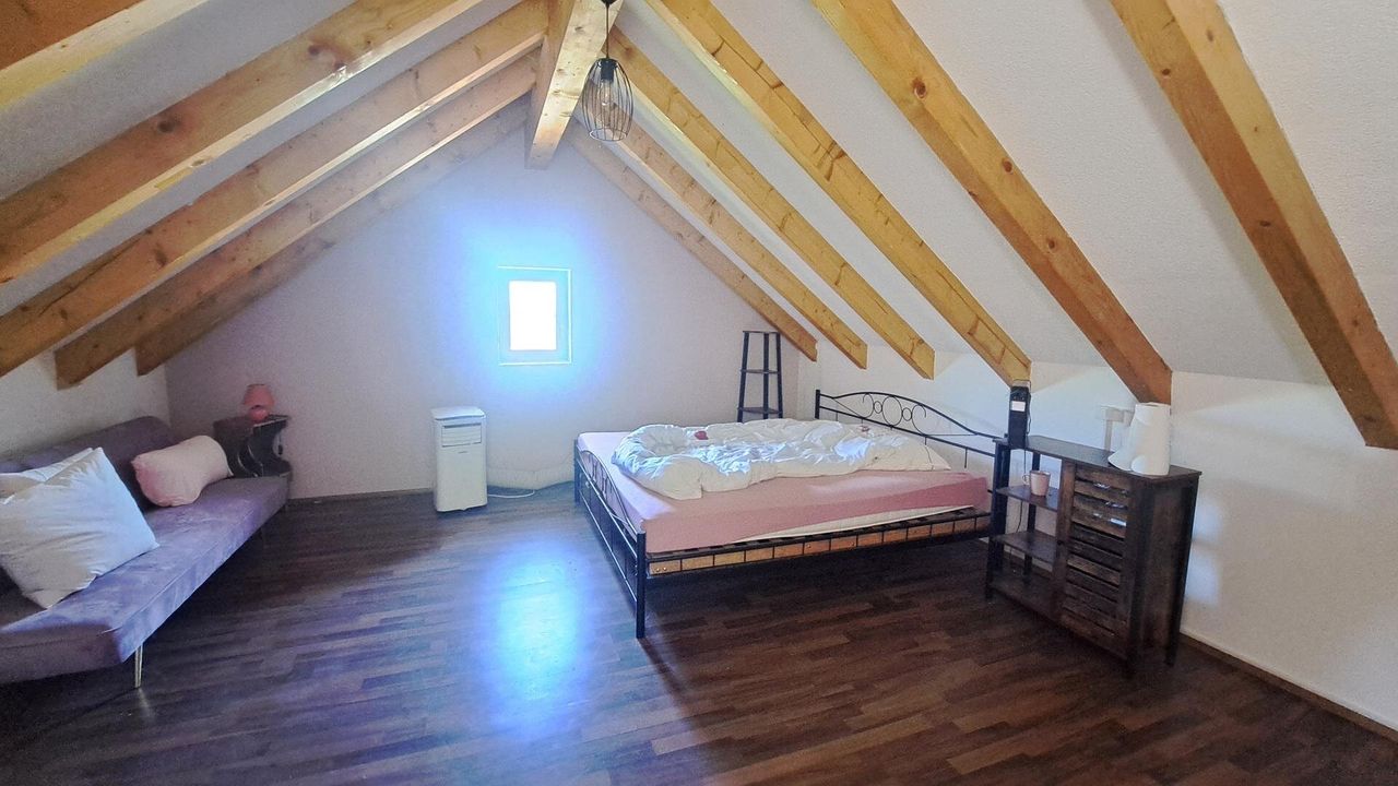 Das Erdgeschoss besteht aus einem großen Raum, beheizt mittels Einzelofen, inkl. Küchenbereich, einem kleinen, separaten Badezimmer mit Dusche, Waschbecken und WC. An der rückseitigen Wand befindet sich der Zugang zum Gewölbekeller. Eine schmale Holztreppe führt in das ausgebaute Obergeschoss mit weiteren 25 m² – ideal als Schlaf- oder Aufenthaltsraum.