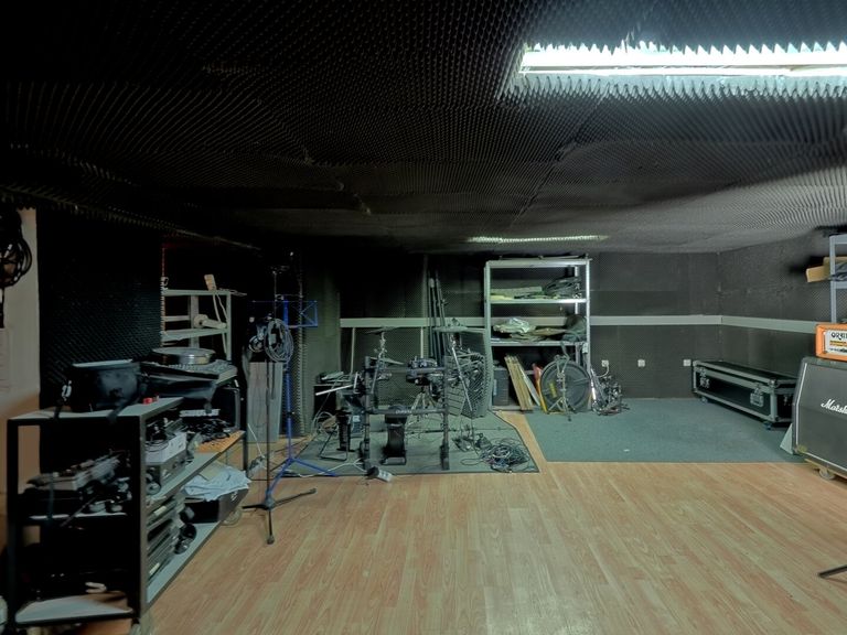 Über einen kleinen Vorraum betritt man den großen Raum, der mit einem Laminatboden ausgestattet ist. Eine Hälfte des Raumes ist als Aufenthaltsraum mit einem kleinen Küchenblock eingerichtet, die andere Hälfte ist mit schallschluckenden Schaumgummi-Elementen ausgestattet. Davon abgetrennt gibt es einen Abstellraum (ca. 4,5m²).