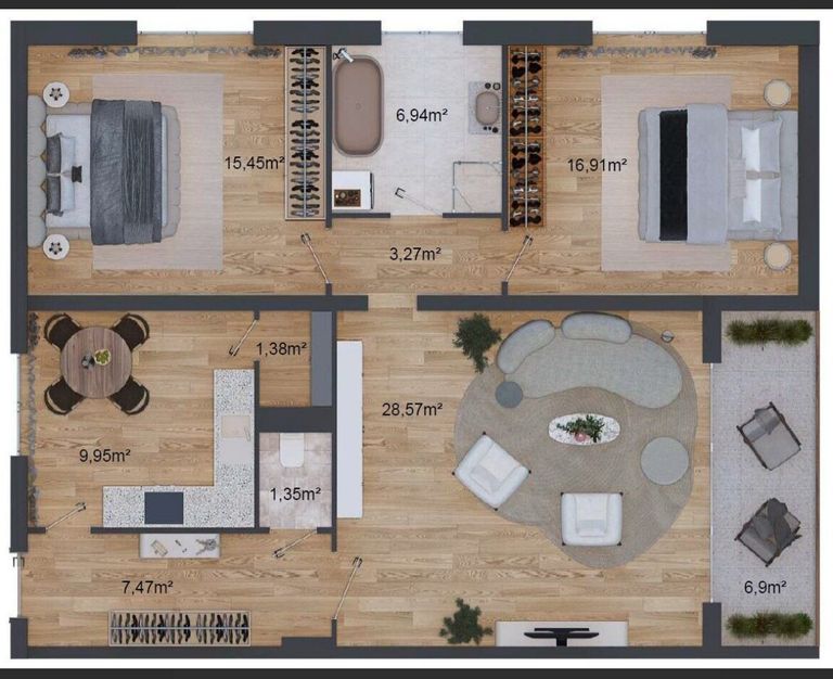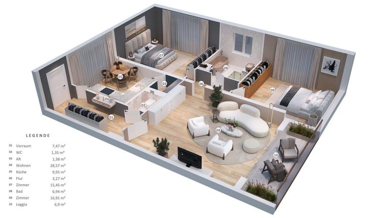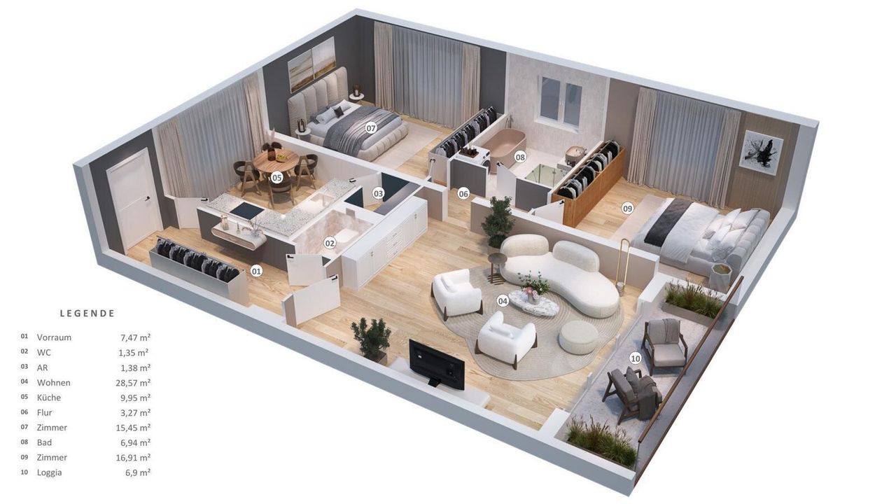 Stellen Sie sich vor, wie die Morgensonne den offenen, lichtdurchfluteten Wohn‑/Essbereich Ihrer neuen Wohnung belebt. Das durchdachte Raumkonzept mit rund 98 m² (inklusive Loggia) bietet viel Platz zum Leben, Arbeiten und Entspannen. Die südostseitige Loggia wird schnell Ihr Lieblingsplatz – ob für das Frühstück im Freien oder den entspannten Feierabend.