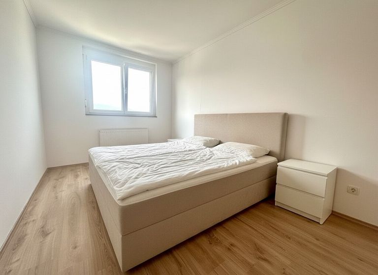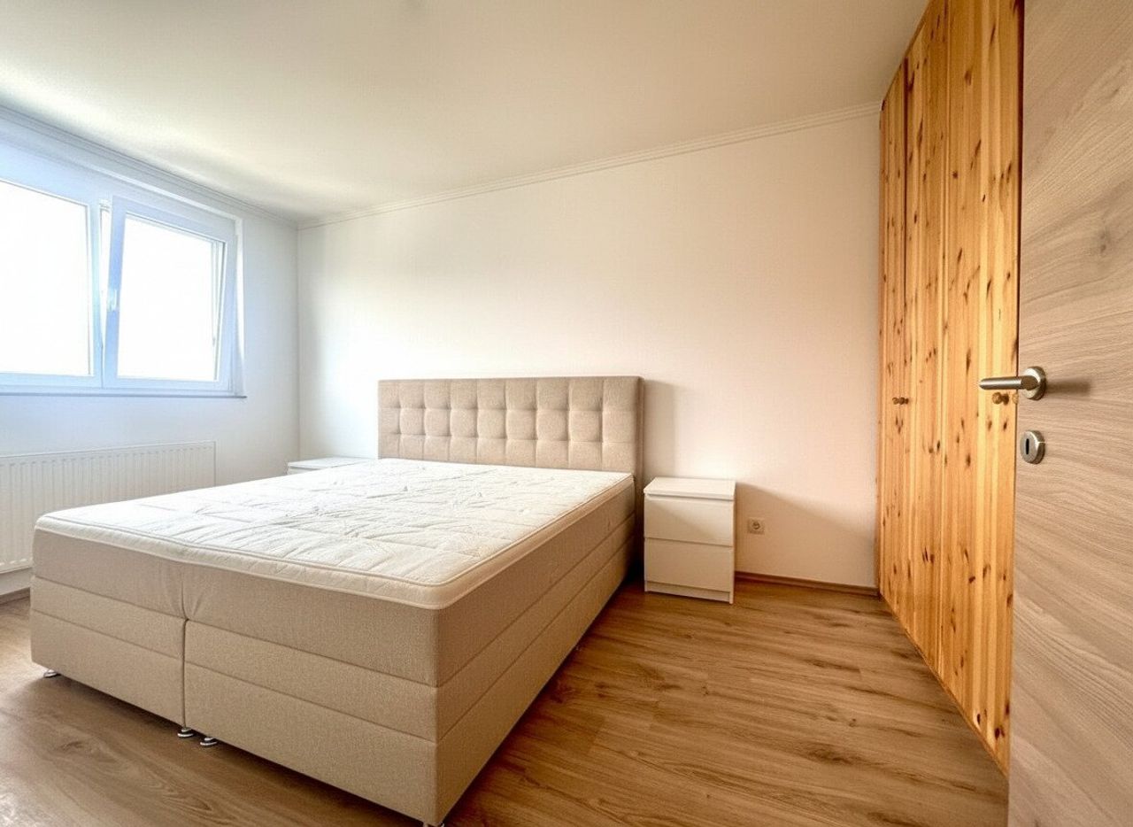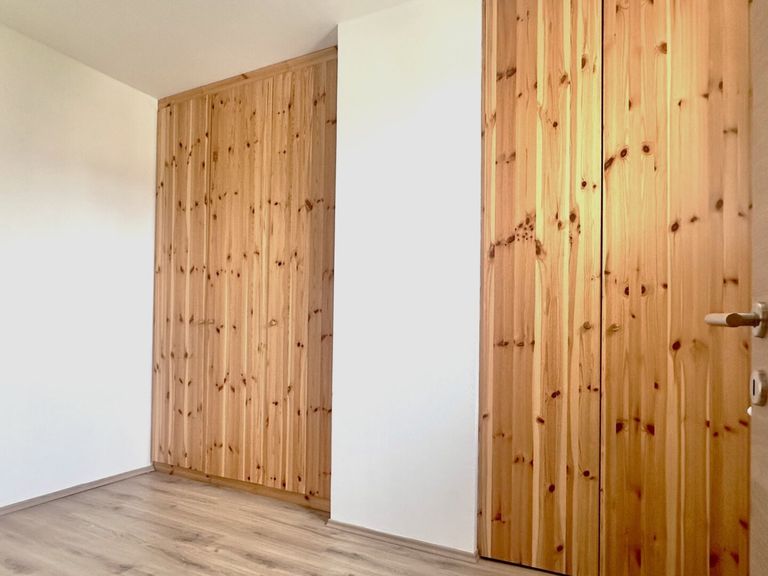 Das Schlafzimmer verfügt über Außen-Rolläden, einen Einbauschrank sowie - bei Bedarf - ein Holz-Doppelbett mit Lattenrost. Der Vorraum mit eingebauter Garderobe sorgt für einen freundlichen Empfang und viel Stauraum.