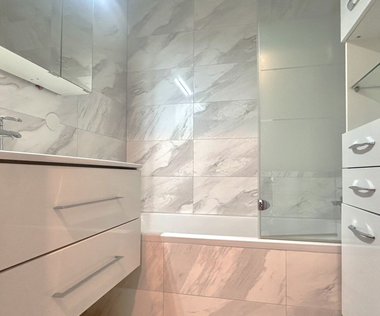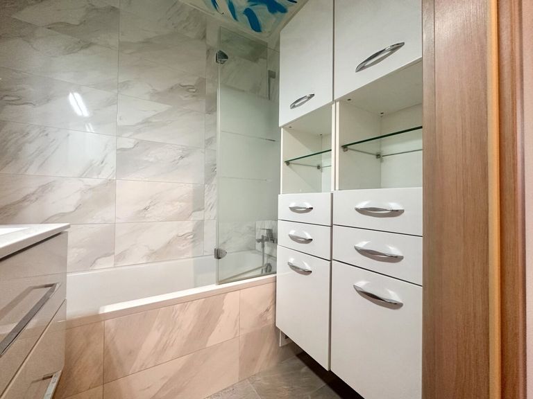 Das Bad ist kompakt und sinnvoll genutzt, ausgestattet mit Badewanne und weißem Einbauschrank. Das WC ist separat, modern und gepflegt, was den Wohnkomfort zusätzlich erhöht. Eine praktische Abstellnische runden das Raumangebot ab.