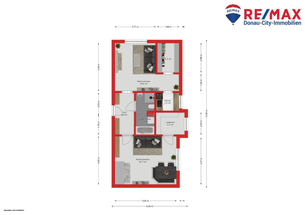 Die Wohnfläche gliedert sich in ein gemütliches Wohnzimmer, ein ruhiges Schlafzimmer sowie ein separates Kabinett, das sich ideal als Arbeits- oder Ankleidezimmer eignet. Ergänzt wird das Raumangebot durch eine funktionale Küche sowie ein Badezimmer mit WC.