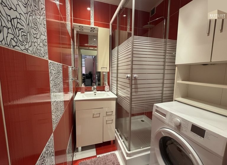 Auch das Badezimmer überzeugt mit einer modernen Ausstattung, Dusche, Waschmaschinenanschluss und praktischen Stauraumlösungen.