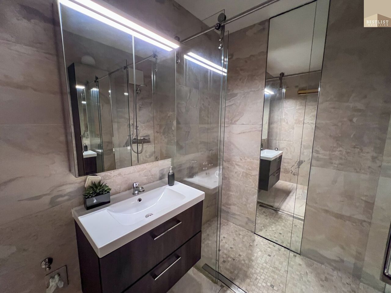 Das modernisierte Badezimmer ist mit einer Dusche sowie einem Waschmaschinenanschluss ausgestattet.