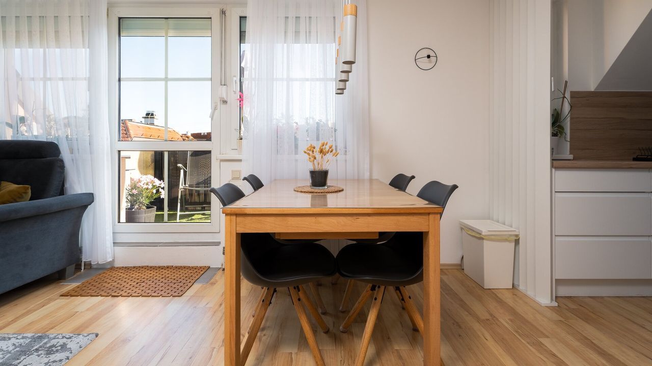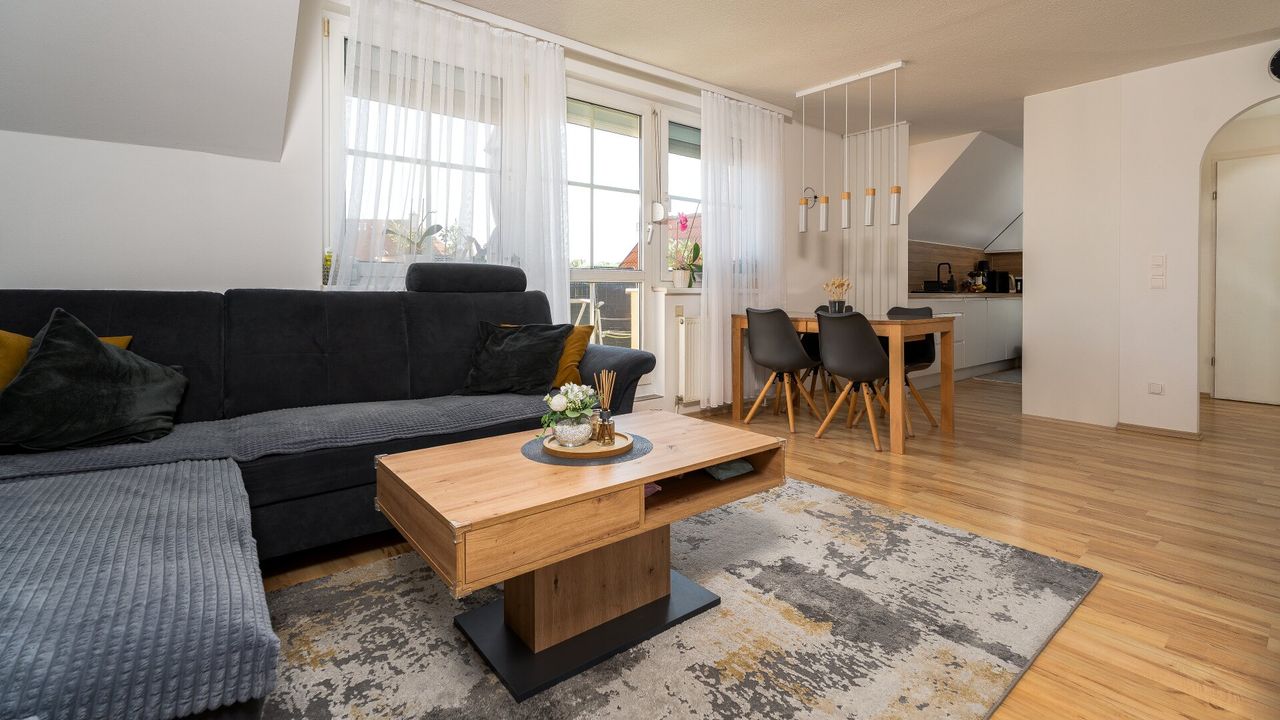 Über den Vorraum gelangt man direkt in das lichtdurchflutete Wohnzimmer, das harmonisch mit der modernen Küche verbunden ist. Die neuwertige Einbauküche lässt keine Wünsche offen.