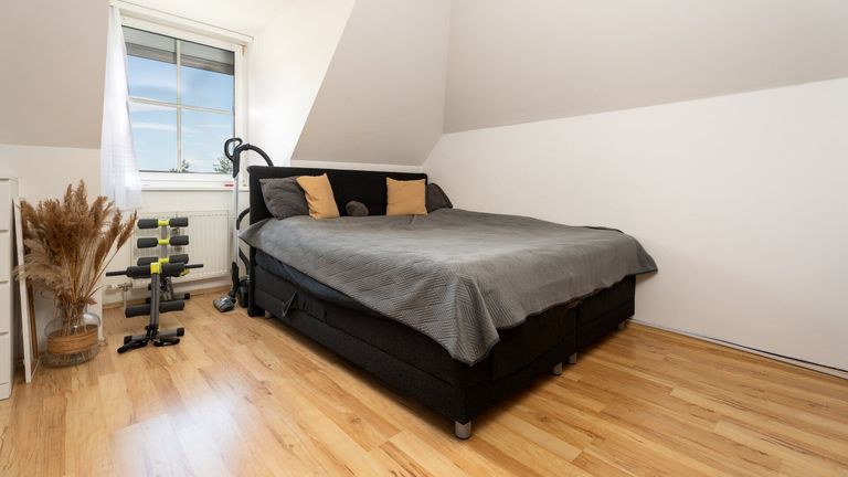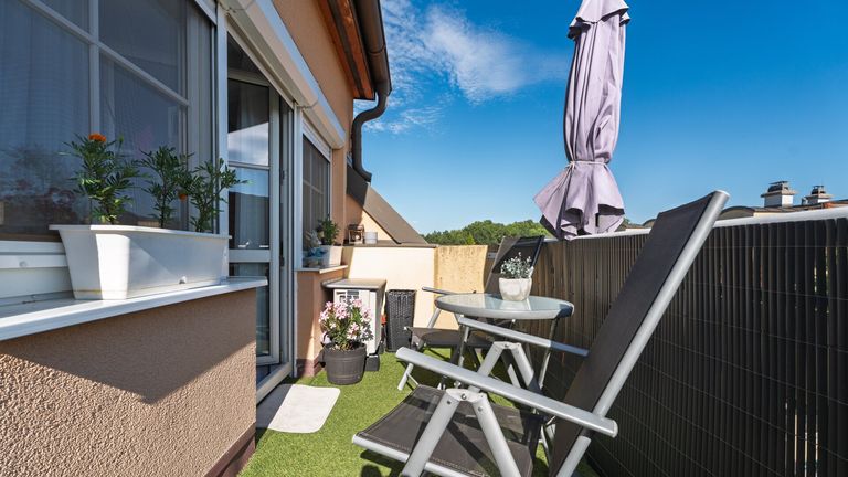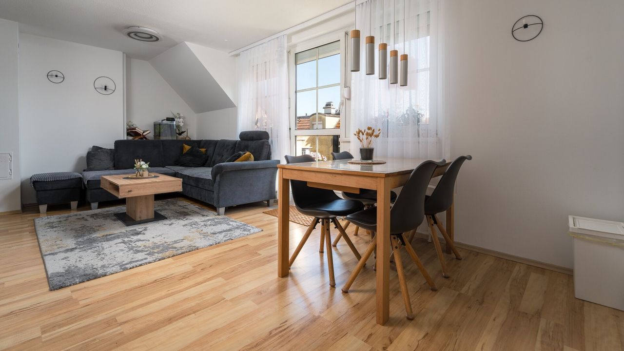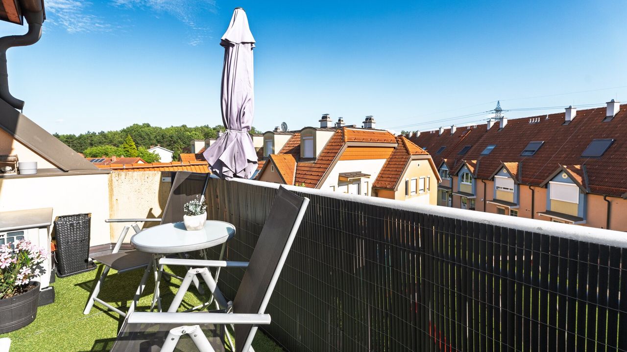 Vom Wohnzimmer aus ist auch die ca. 8 m² große Dachterrasse zugänglich, die zum Entspannen oder Frühstücken im Freien einlädt.