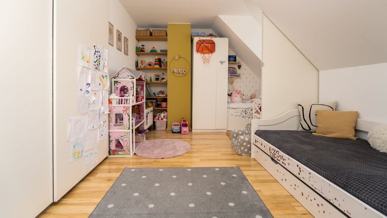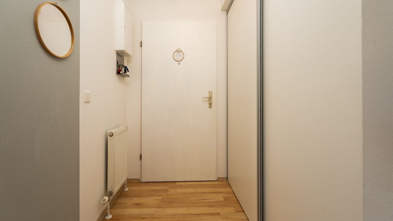 Ein zentraler Flur verbindet alle weiteren Räume der Wohnung: das separate WC, das Badezimmer mit Dusche und Badewanne, sowie zwei weitere Zimmer – ein Schlafzimmer und ein Kinderzimmer. Derzeit ist das Schlafzimmer mit einem großen praktischen Schrankraum ausgestattet, der bei Bedarf als drittes Zimmer genutzt werden kann.