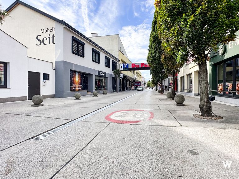 Das Gebäude weist eine gemischte Nutzung auf – im Erdgeschoß befinden sich drei Geschäftslokale, im ersten Stock zwei Wohneinheiten, und das Dachgeschoß wird ausschließlich von dieser Wohnung eingenommen.