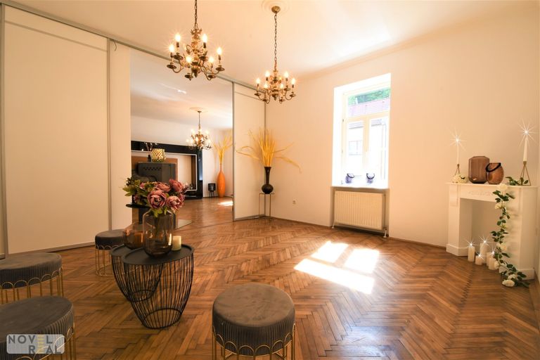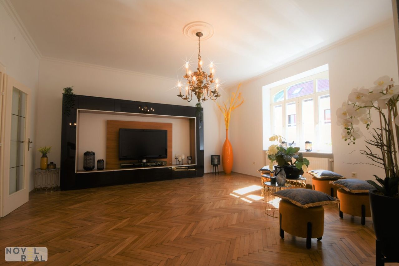 Die Wohnung erstreckt sich über das Erdgeschoß sowie das Dachgeschoß einer sanierten Jugendstil-Villa.