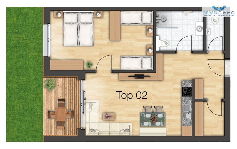 Die Top 2 im Erdgeschoss des Haus 1 bietet auf rund 54 m² einen hellen Wohn-Essbereich mit Küchenzeile, Schlafzimmer, Bad, Abstellraum sowie eine Terrasse mit Gartenanteil.