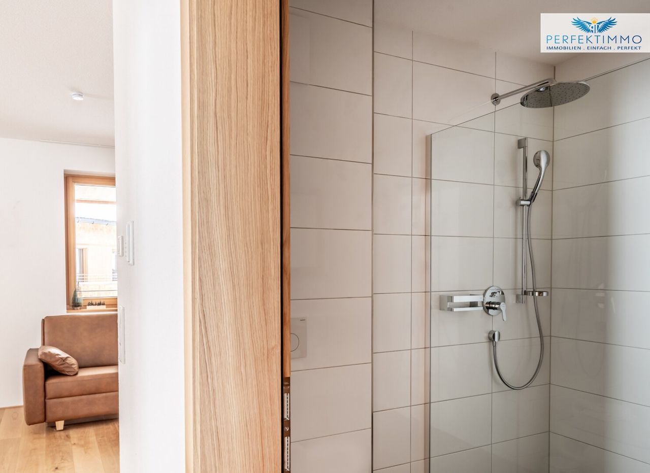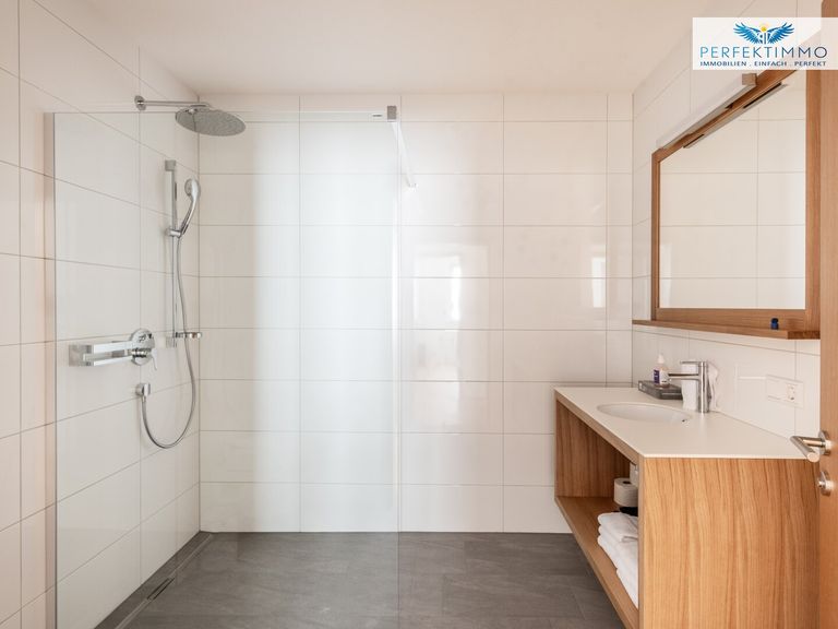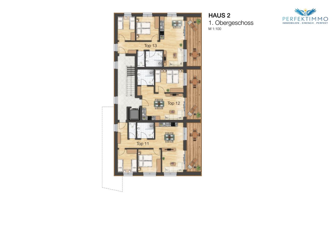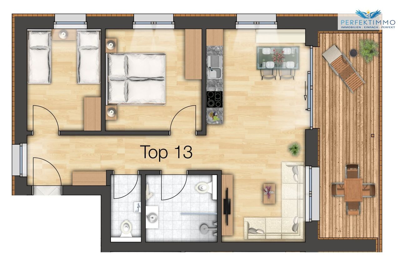 Das Top 13 im 1.OG des Haus 2 umfasst ca. 66 m² und bietet einen hellen Wohn-Essbereich mit Küchenzeile, 2 Schlafzimmer, ein Bad mit Regendusche und WC, ein separates WC sowie einen überdachten Balkon.