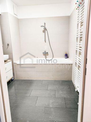 - Badezimmer mit Badewanne und Waschmaschinenanschluss
