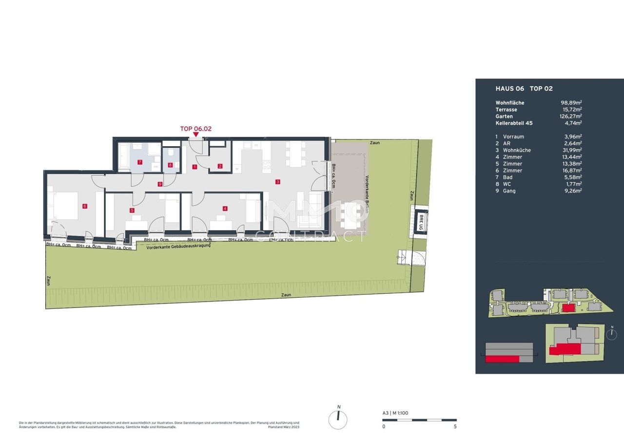 Diese großzügige 4-Zimmer-Wohnung mit ihrem ca. 126 m2 großen Garten ist nach Südosten ausgerichtet und befindet sich barrierefrei im Erdgeschoß. Sie besteht aus einem großen Wohn-Esszimmer mit integrierter Küche und Ausgang auf die 15 m2 große Terrasse und den Garten. Die 3 Schlafzimmer zeigen in Ihren privaten ruhigen Garten nach Süden. Das Bad mit Badewanne, Dusche und Waschmaschinenanschluss ist zeitlos weiß verfließt. Das große Vorzimmer und der Abstellraum bieten viel Stauraum. Ein separates Gäste-WC ist ebenfalls vorhanden.
