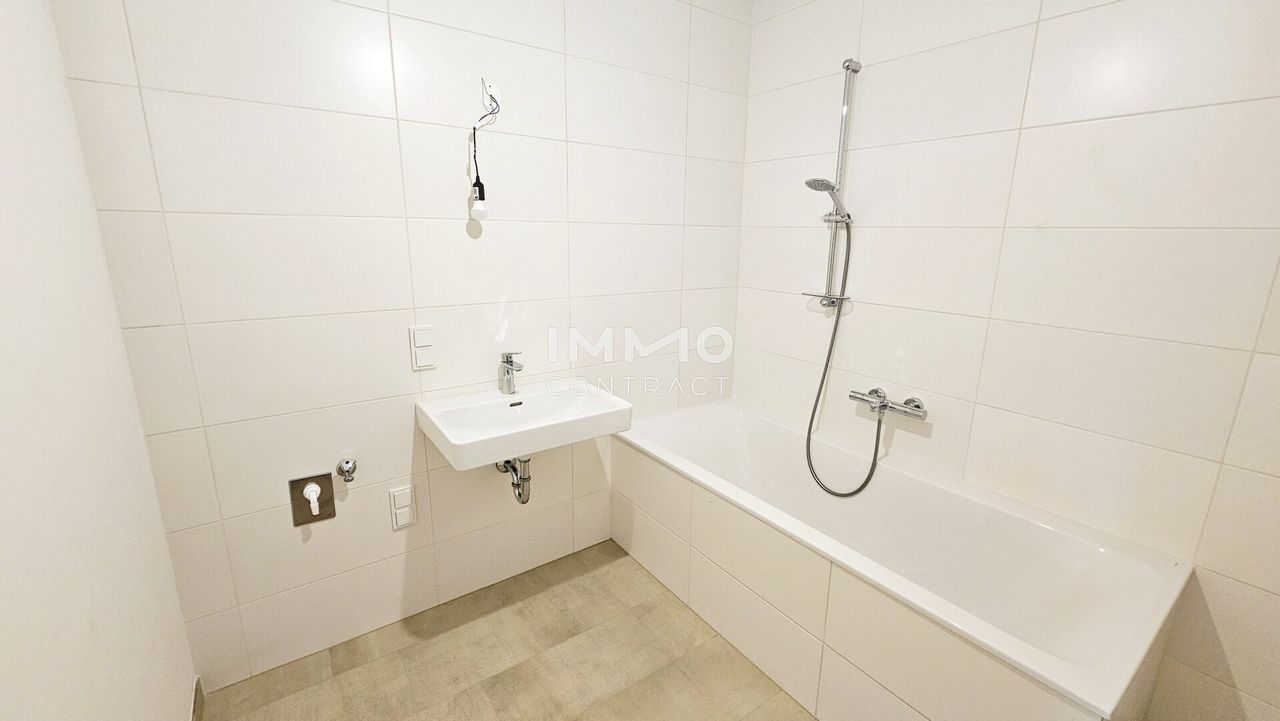 Das Bad mit Badewanne und Waschmaschinenanschluss ist zeitlos weiß verfließt. Das große Vorzimmer und der Abstellraum bieten viel Stauraum. Ein separates Gäste-WC ist ebenfalls vorhanden.