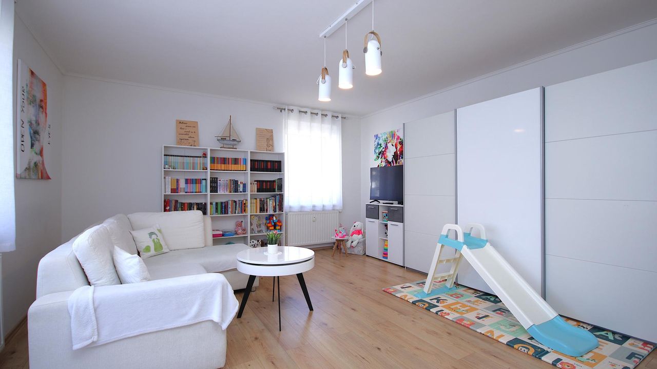 Durch den modernen Grundriss ist jedes Zimmer extra begehbar und schafft so idealen Freiraum für die ganze Familie. Vom großen und hellen Wohnzimmer gelangt man direkt auf den Balkon und kann so die Sonne bis in die Abendstunden genießen.