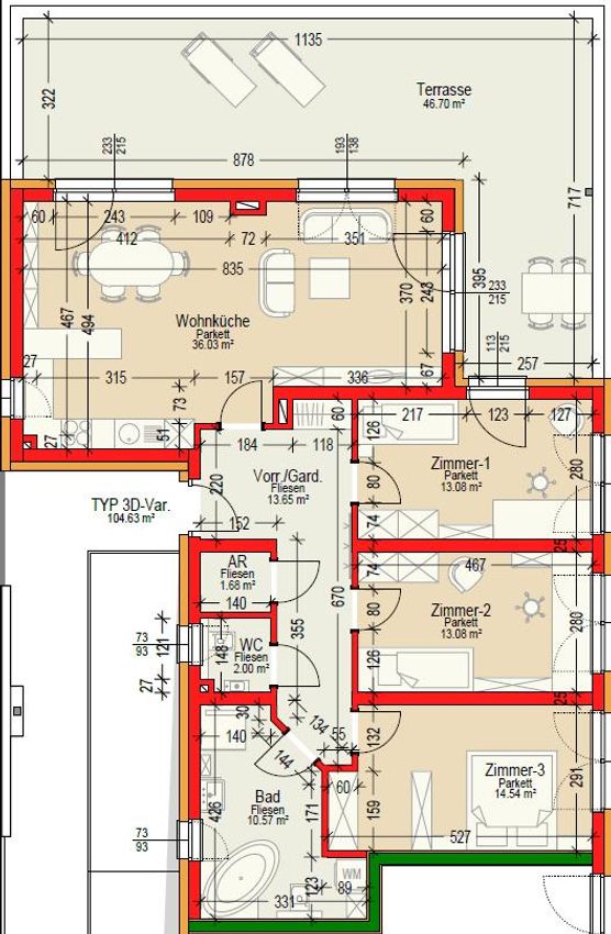 Penthousewohnung für Anleger und Eigennutzer im 2. Stock mit Lift, 104 m² Wohnfläche und 46 m² Dachterrasse, teilweise überdacht