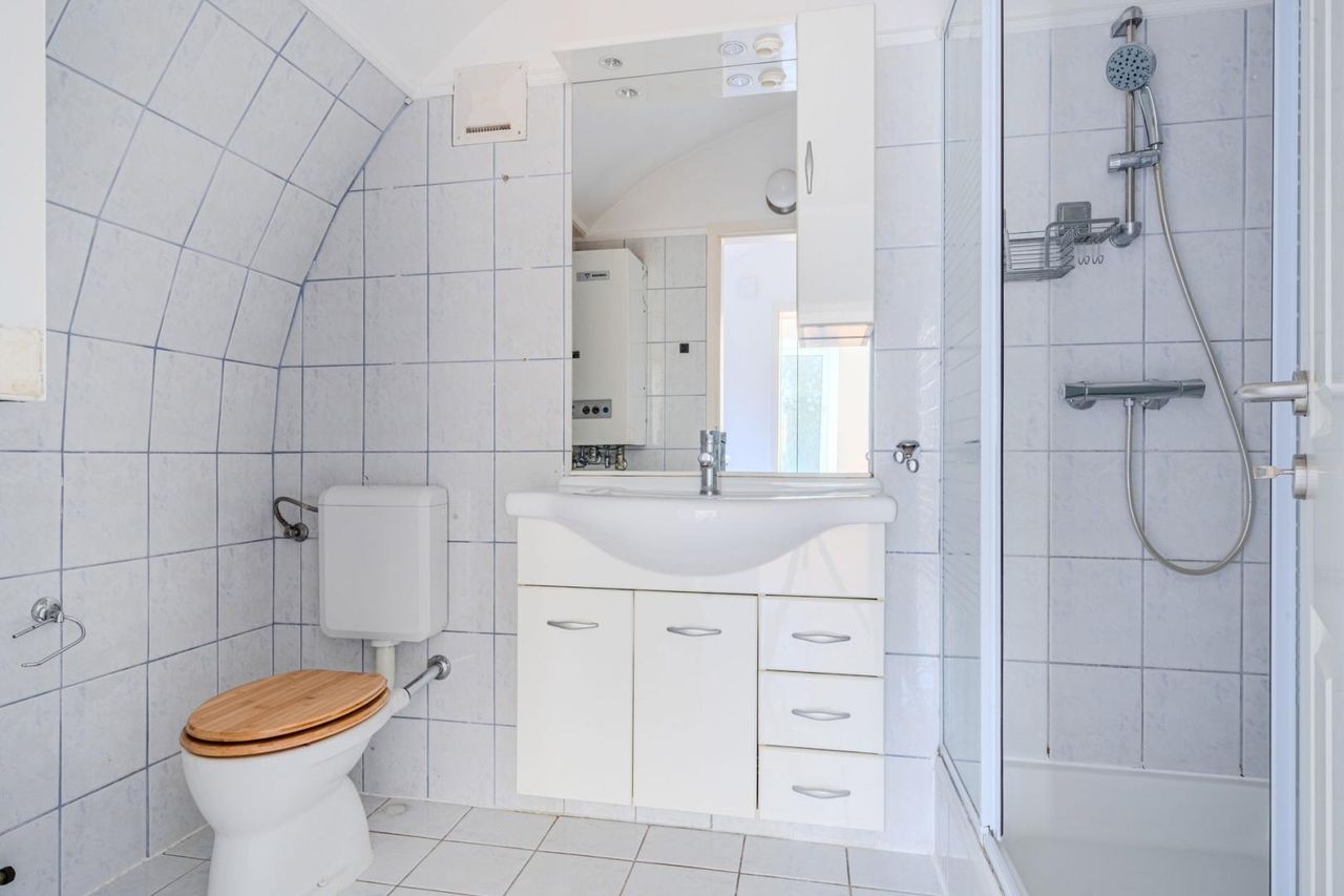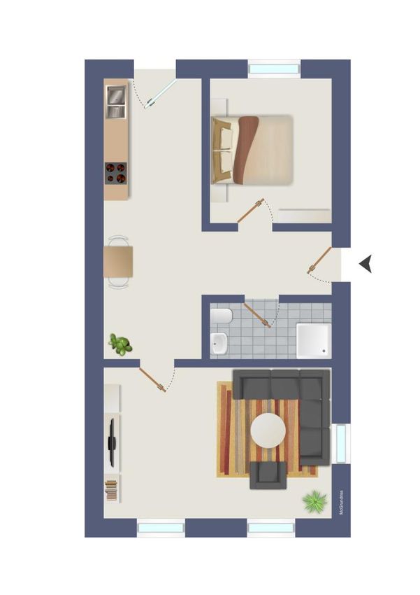 Mit einer Wohnfläche von rund 60 m² umfasst die Einheit ein Wohnzimmer, ein separates Schlafzimmer, eine Küche sowie ein Badezimmer mit Dusche und Waschmaschinenanschluss.