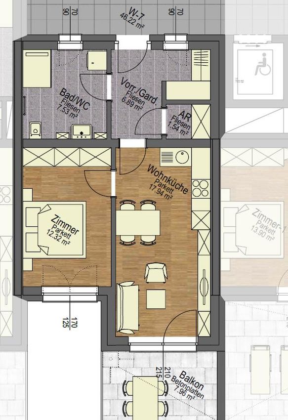 Badesee nur 350 m entfernt! mit 46 m² Wohnfläche, 7 m² Balkon, Keller, Lift
