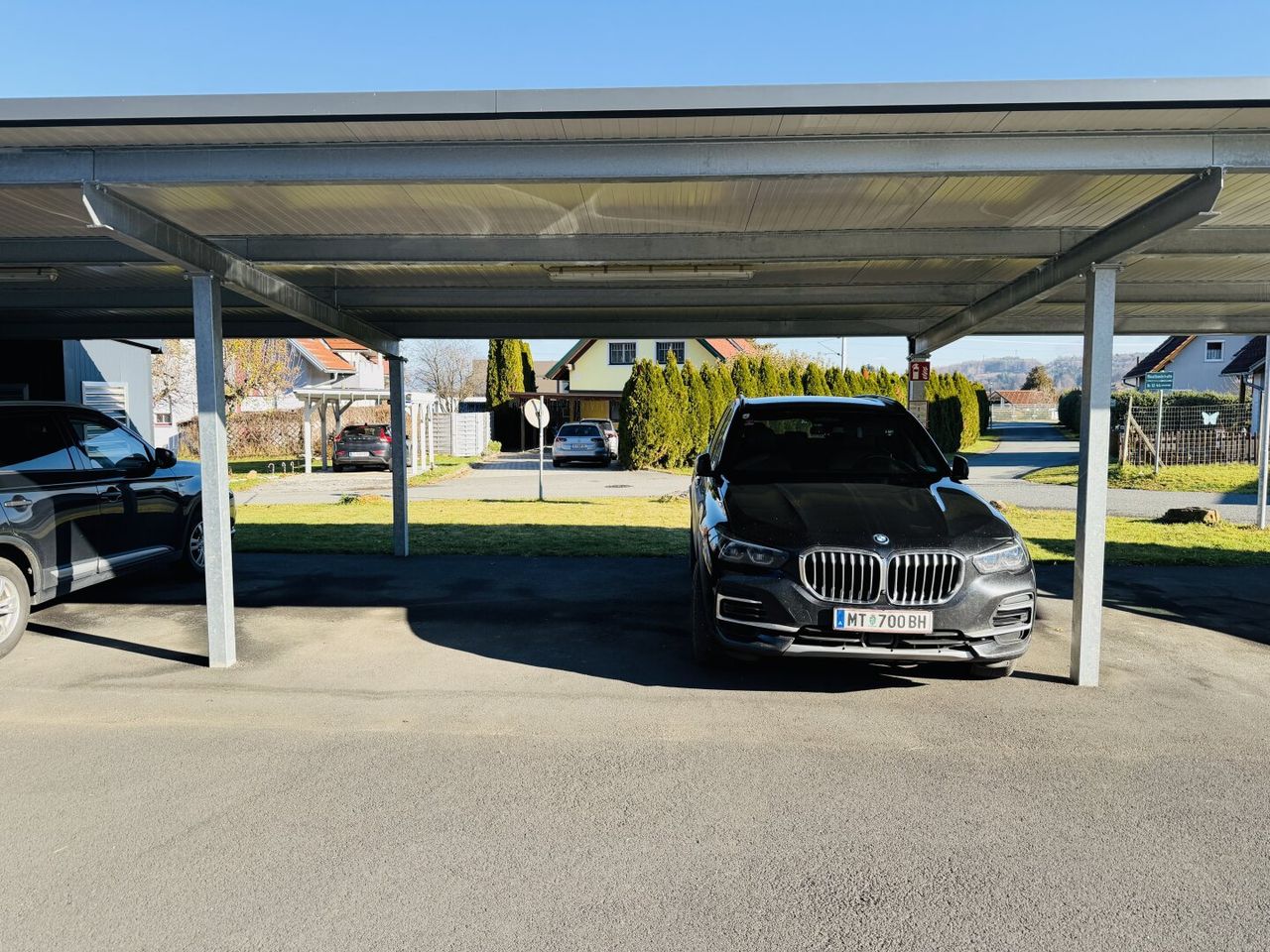 Für Ihre Fahrzeuge stehen zwei Carport Stellplätze wenige Meter neben der Wohnung bereit. Ein Kellerersatzraum befindet sich neben den Carports.