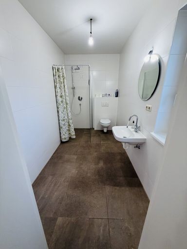 Das Badezimmer verfügt über ein Fenster und ist mit einer modernen Dusche und einem WC ausgestattet.