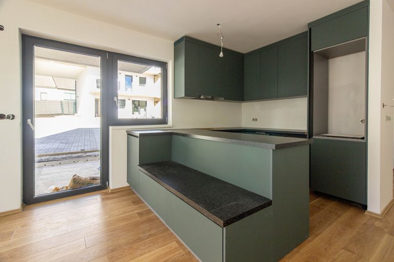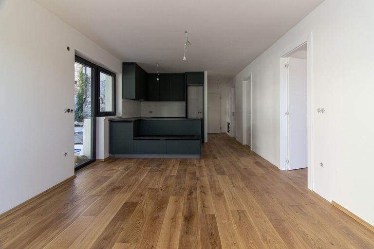 Durch den 27 m² großen Wohnraum betritt man die 12,5 m² große Terrasse und den darauffolgenden 18,40 m² großen Eigengarten. Das Schlafzimmer ist groß genug für zwei und verfügt auch über einen Zugang zum Garten. Für das Design der Küche ist derzeit eine sehr lebendige Farbkombination ausgewählt worden, es besteht jedoch noch die Möglichkeit, diese teilweise zu ändern um sie an Ihren Wünschen anzupassen.