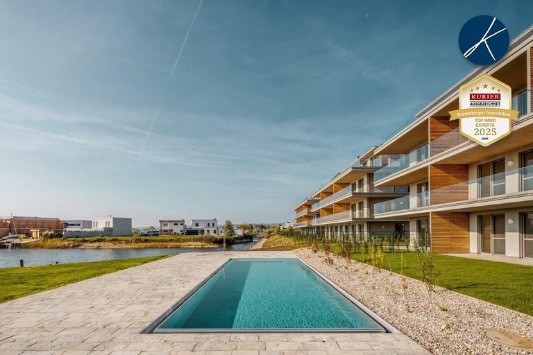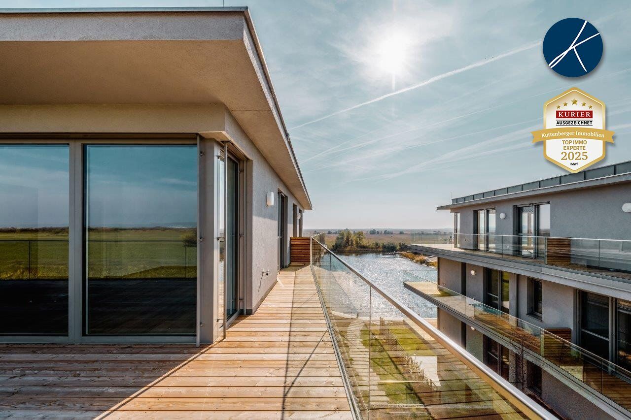 - - - TRAUMHAFTER FERNBLICK VON DER RIESEN TERRASSE - - - Pool, Liegewiese; Fitnessraum und ein Parkplatz im Eigentum! TOP moderne Wohnung mit riesiger Terrasse und vielen anderen Annehmlichkeiten. Zur Verfügung steht Ihnen ein Autoabstellplatz, Fahrrad- und Kinderwagenraum, Fitnessraum, Pool und große Liegewiese. Das gesamte Areal umfasst ca. 10.000 m². 2 Zimmer, Bad mit Wanne, WC, Abstellraum und geräumige Terrasse mit Blick bis zum Leithagebirge und zum Grünbereich mit See. Trotz geringer Bauhöhe wurde in jeder Stiege ein Lift gebaut, sodass auch auf Barrierefreiheit geachtet wurde. Hier wohnen Sie das ganze Jahr wie im Urlaub. Die schönsten Radstrecken...