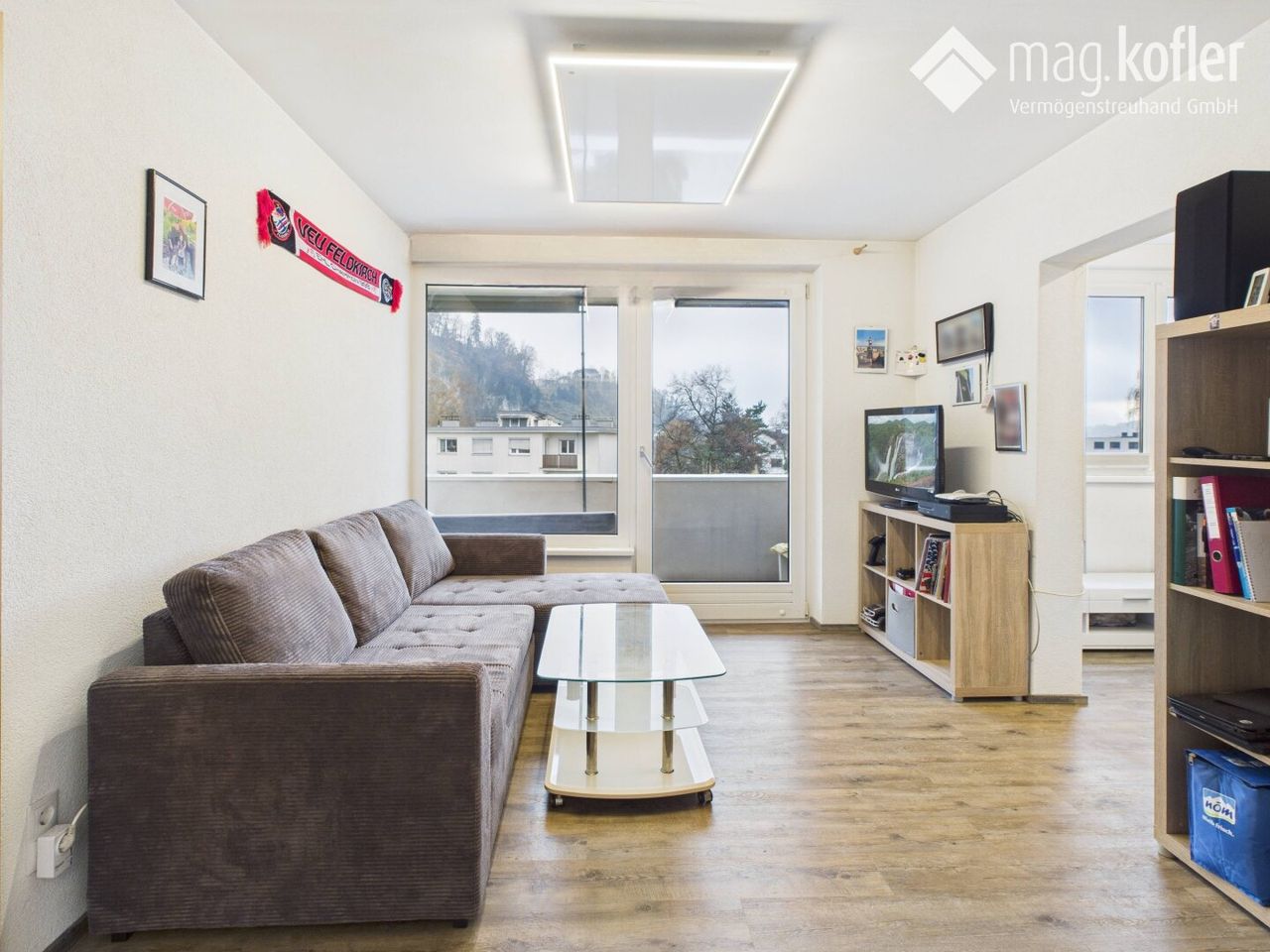 Der Wohnbereich mit direktem Zugang zum Balkon bietet einen Blick über Feldkirch bis in die umliegende Bergwelt – ein Platz zum Ankommen und Wohlfühlen.
