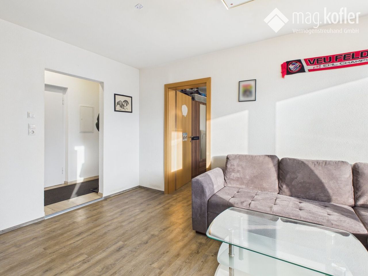 Der Wohnbereich mit direktem Zugang zum Balkon bietet einen Blick über Feldkirch bis in die umliegende Bergwelt – ein Platz zum Ankommen und Wohlfühlen. Ein separates Schlafzimmer, ein Badezimmer sowie eine kompakte Küche runden das Raumangebot ideal ab.