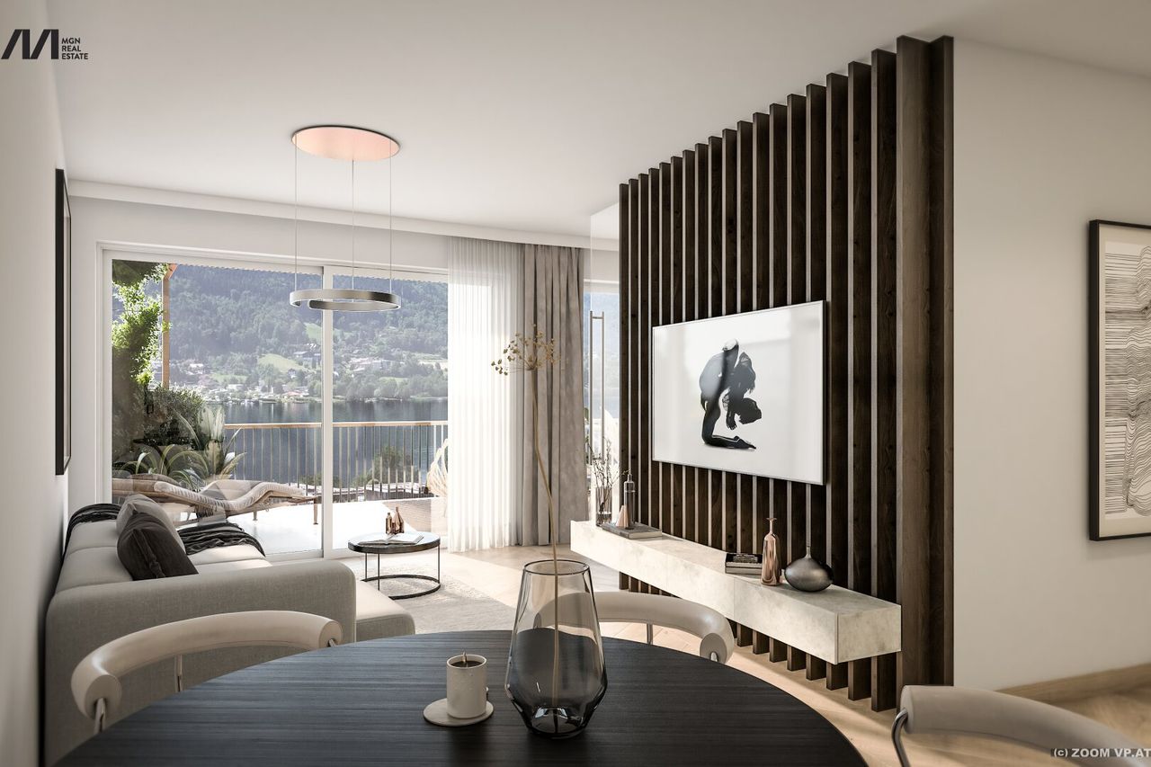 Diese exklusive 2-Zimmer-Terrassenwohnung bietet ein Wohnerlebnis der Extraklasse. Von Ihrer großzügigen Terrasse aus genießen Sie einen spektakulären Ausblick auf den Ossiacher See und das beeindruckende Panorama der umliegenden Berge. Die Wohnung zeichnet sich durch lichtdurchflutete Räume und eine hochwertige Ausstattung aus Hier wird moderne Eleganz mit Gemütlichkeit vereint.
