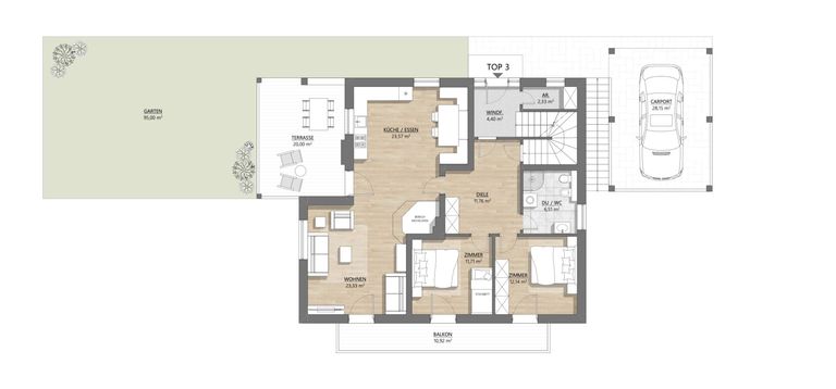 Ein eigener Gartenanteil sowie ein Carport runden dieses attraktive Angebot ab.