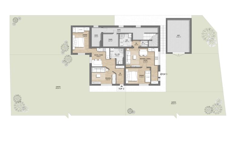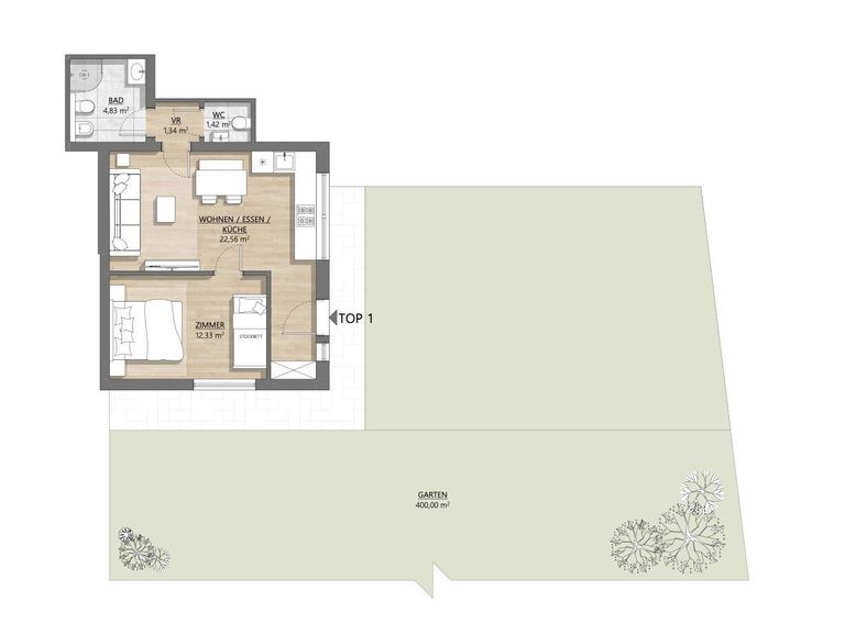 43,48 m2 Wohnung mit 2 Zimmer, 409 m2 Eigengarten, 1 Stellplatz und 1 großzügigem AR