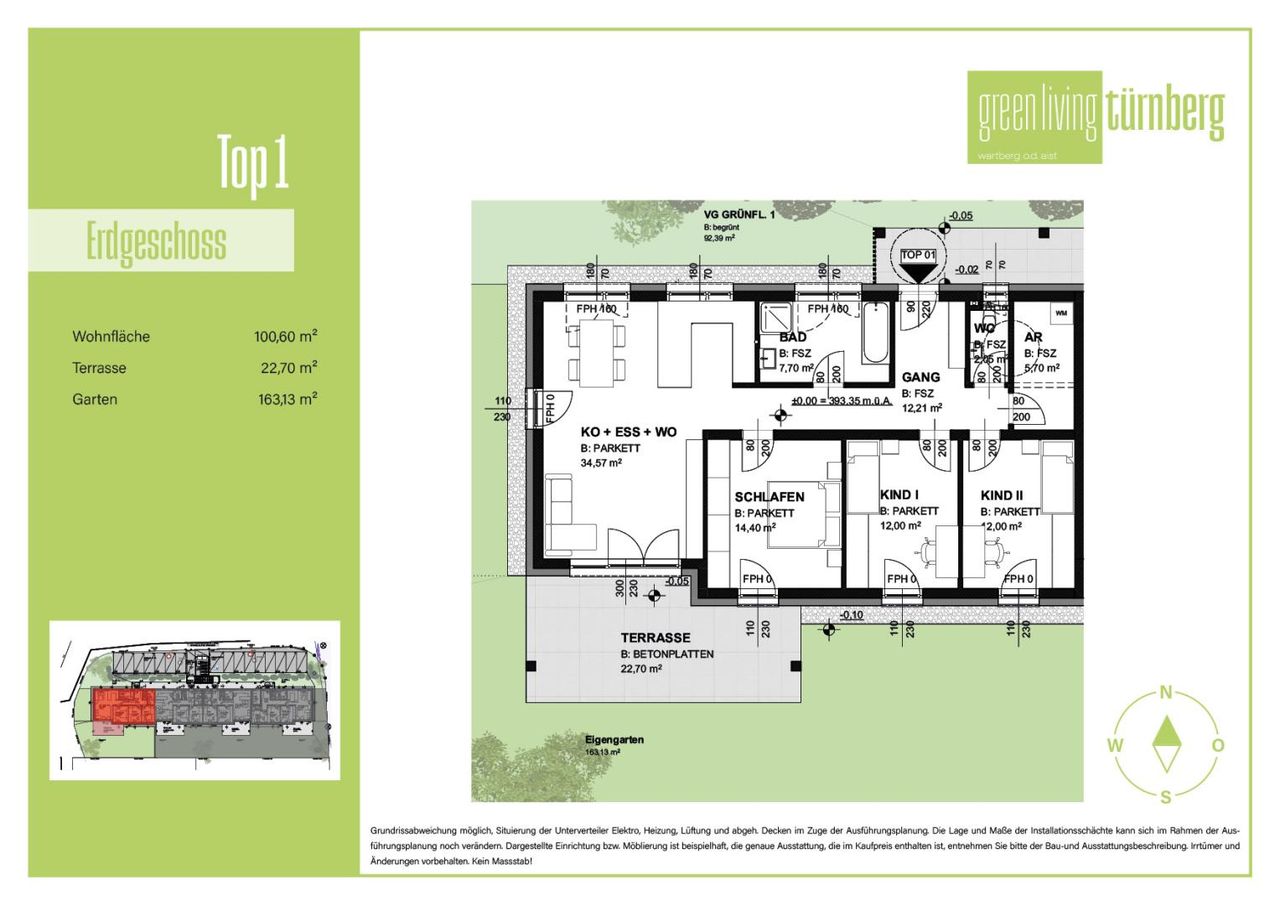 Gartenwohnung Top 1 mit ca. 100,63 m² Wohnfläche und ca. 163 m² Eigengarten (von allen Zimmer begehbar):