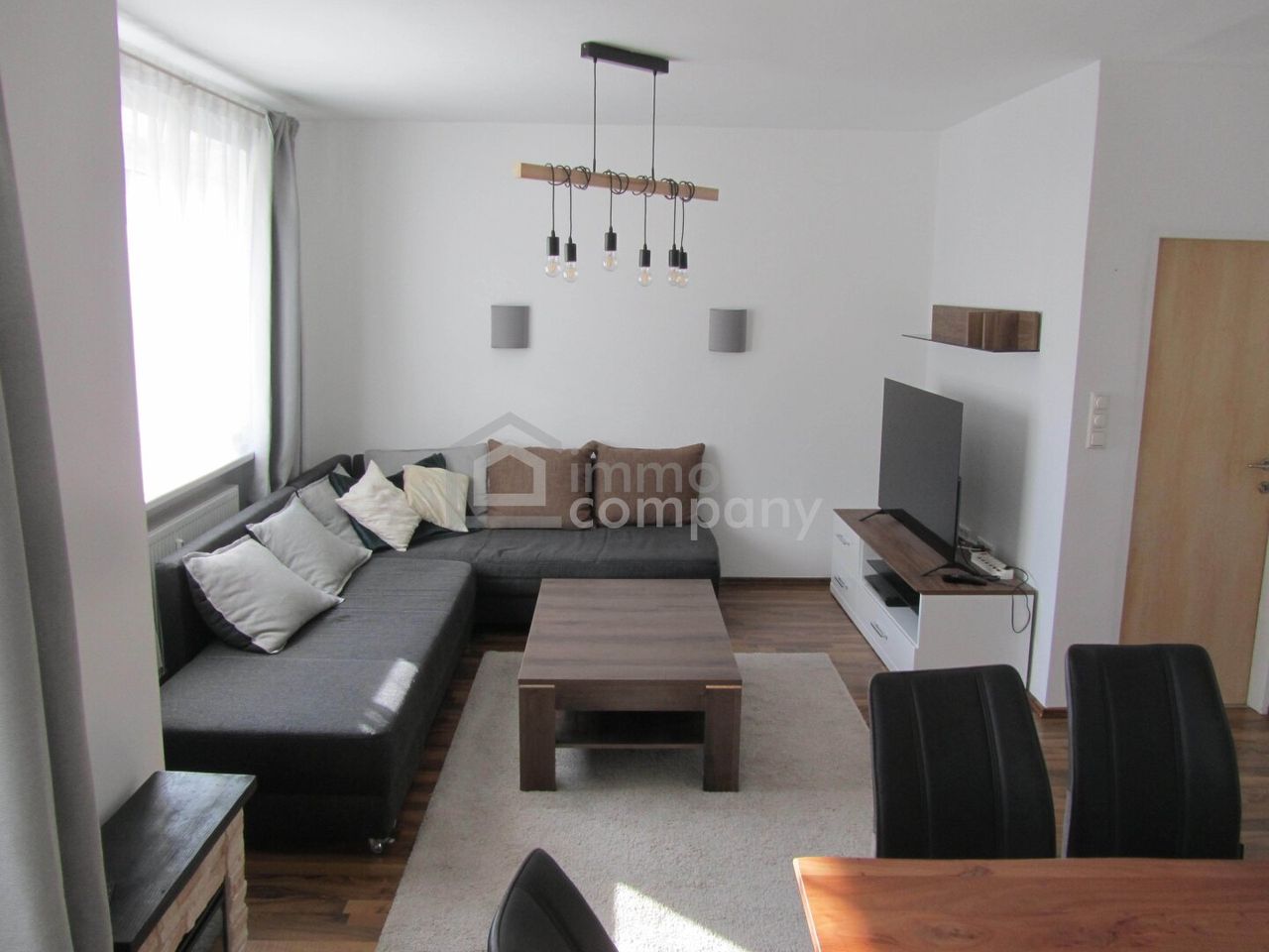 Großzügiges helles Wohnzimmer mit integrierter Wohnküche, vollausgestattet.