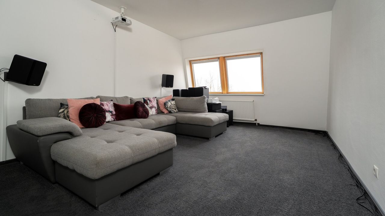 Über eine Treppe erreicht man die obere Etage der Maisonette. Der zentrale Gang führt rechterhand in das Badezimmer sowie in das erste große Schlafzimmer - ausgestattet mit einer hochwertigen Heimkinoanlage. Linkerhand befindet sich ein weiterer Abstellraum, der sich ideal als kleiner begehbarer Schrank eignet.