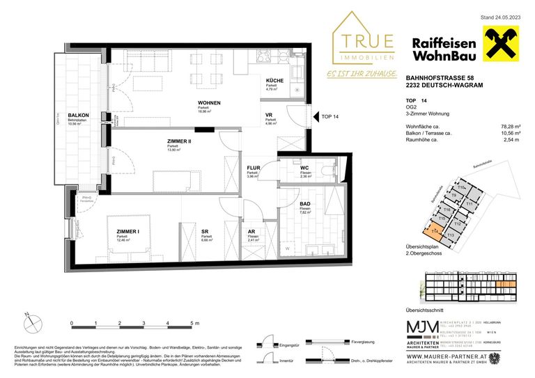 - Wohnnutzfläche von rund 78 m² bestehend aus Vorraum, Flur, WC, Abstellraum, Bad, Kinderzimmer, Schlafzimmer, Wohnküche