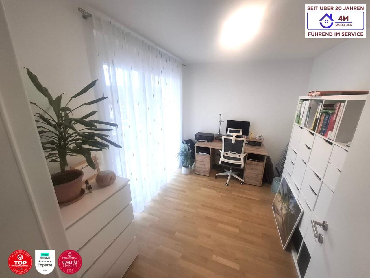 Der private Bereich wirkt ruhig und reduziert: ein gemütliches Schlafzimmer, ein weiteres Zimmer für Arbeit, Kind oder Gäste sowie ein hochwertiges Bad mit Walk-in-Dusche. Das WC ist separat. Fußbodenheizung in allen Räumen, elektrische Außenraffstores, Insektenschutz (außer im Wohnzimmer) und Glasfaser sorgen für modernen Wohnkomfort.