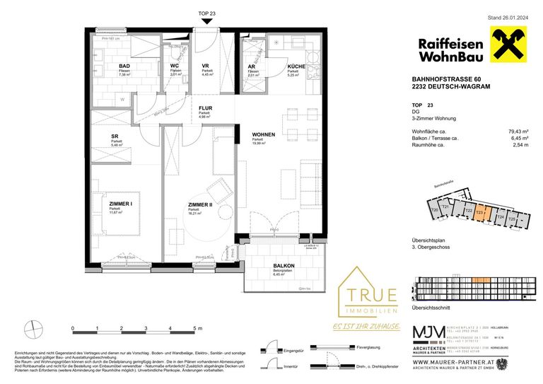 - Wohnnutzfläche von rund 79,43 m² bestehend aus Vorraum, Flur, WC, Abstellraum, Bad, Wohnküche, Schlafzimmer, Kinderzimmer, Schrankraum