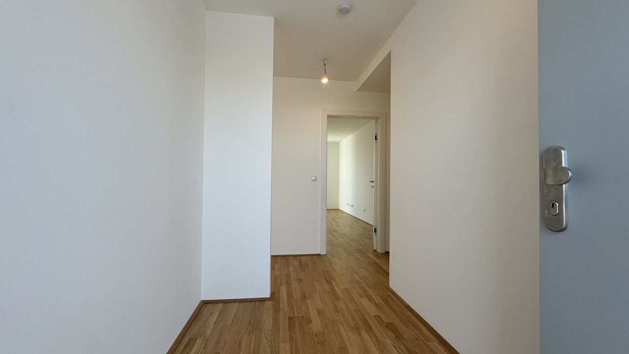 Durch den Vorraum gelangt man in den Flur, dieser führt direkt zum ersten Schlafzimmer mit Ausgang auf den Balkon. Ebenso führt der Flur in das zweite Schlafzimmer mit Schrankraum. Badezimmer mit Dusche als auch WC mit Handwaschbecken sind durch den zentralen Flur ebenso begehbar. Die Wohnküche rundet das Angebot ab, man hat hier ebenso einen Zugang auf den Balkon.