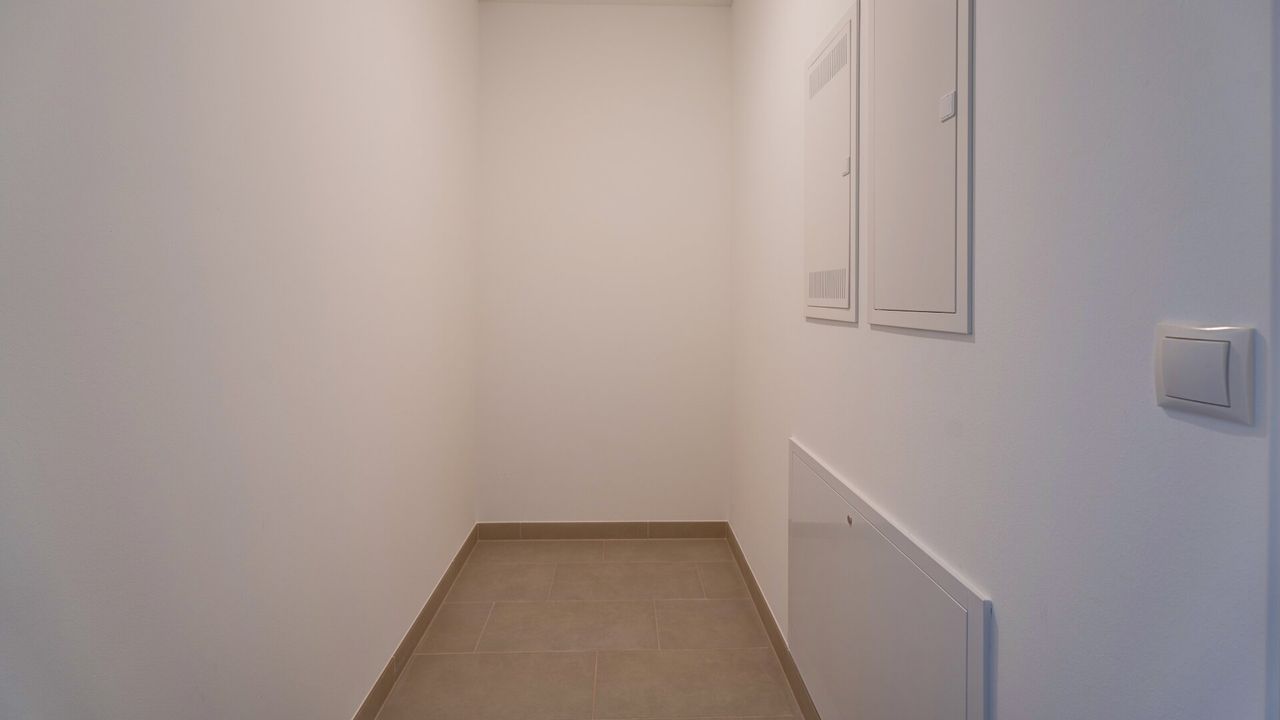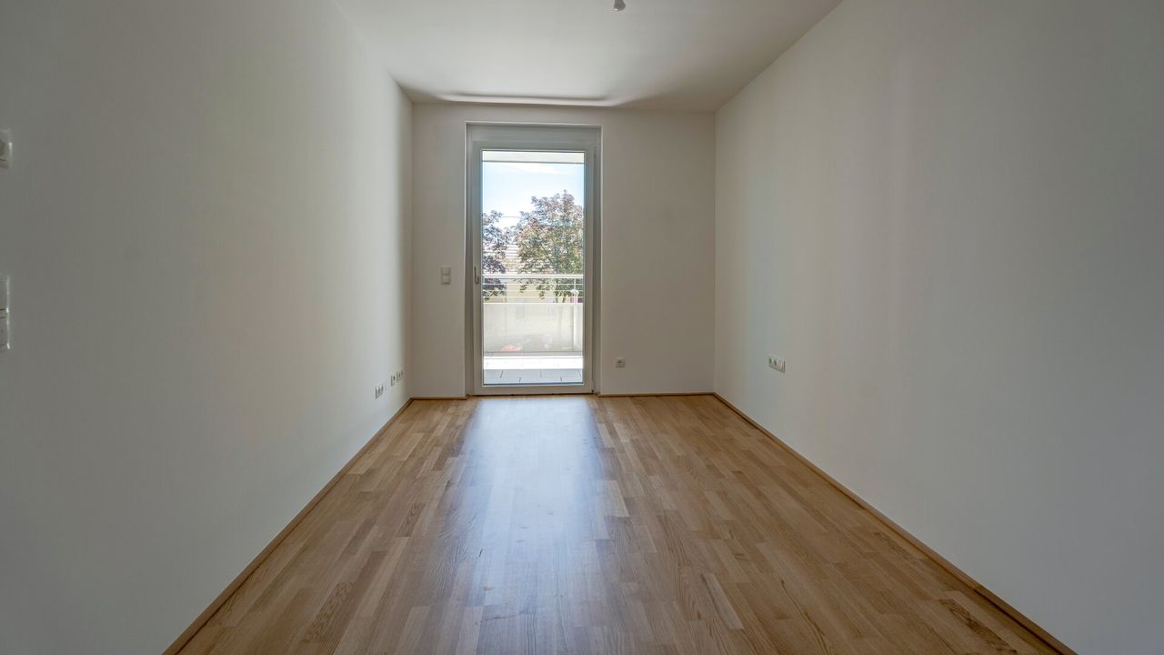 Rechterhand steht Ihnen ein Schrankraum, ein Bad mit Dusche und Waschmaschinenanschluss zur Verfügung. Weiters gelangen Sie in das Schlafzimmer von welchen Sie wiederum die Loggia betreten können.