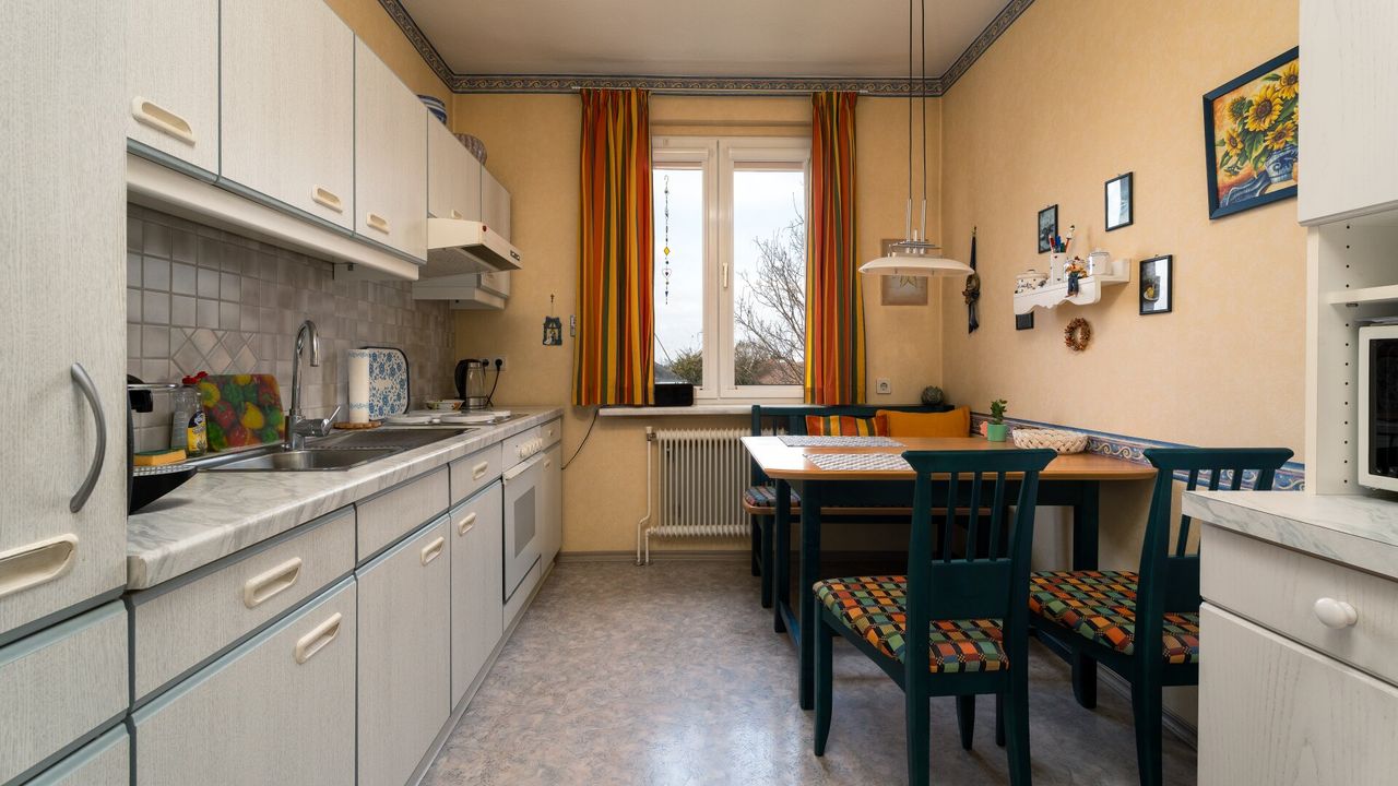 Direkt linker Hand beim Eingang befindet sich das Badezimmer mit Dusche, anschließend das separate WC. Entlang des Vorraums gelangt man weiter zur Küche, die ausreichend Platz für einen Essbereich bietet.