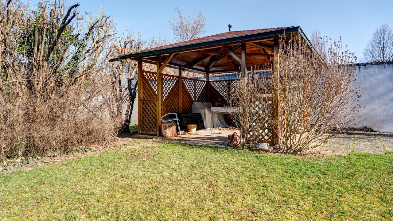 Gepflegter Gemeinschaftsgarten mit Pavillon