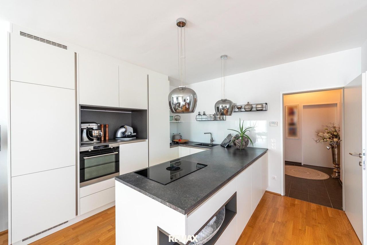 Der großzügige Wohnbereich bietet ausreichend Platz für eine stilvolle Couch, einen gemütlichen Essbereich und eine große Küche. Die hochwertige HAKA-Küche mit Bora-Kochfeld ist ein echtes Highlight für Kochbegeisterte.