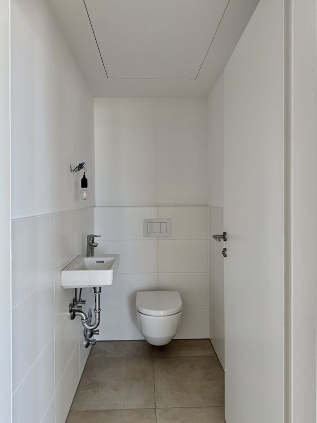 Das Badezimmer präsentiert sich modern und stilvoll zugleich. Großformatige Feinsteinzeugfliesen, eine Badewanne, eine bodengleiche Dusche mit Edelstahlablaufrinne sowie hochwertige Markenarmaturen schaffen ein komfortables Wohlfühlambiente. Ein elektrischer Handtuchheizkörper ergänzt die Ausstattung funktional und elegant.