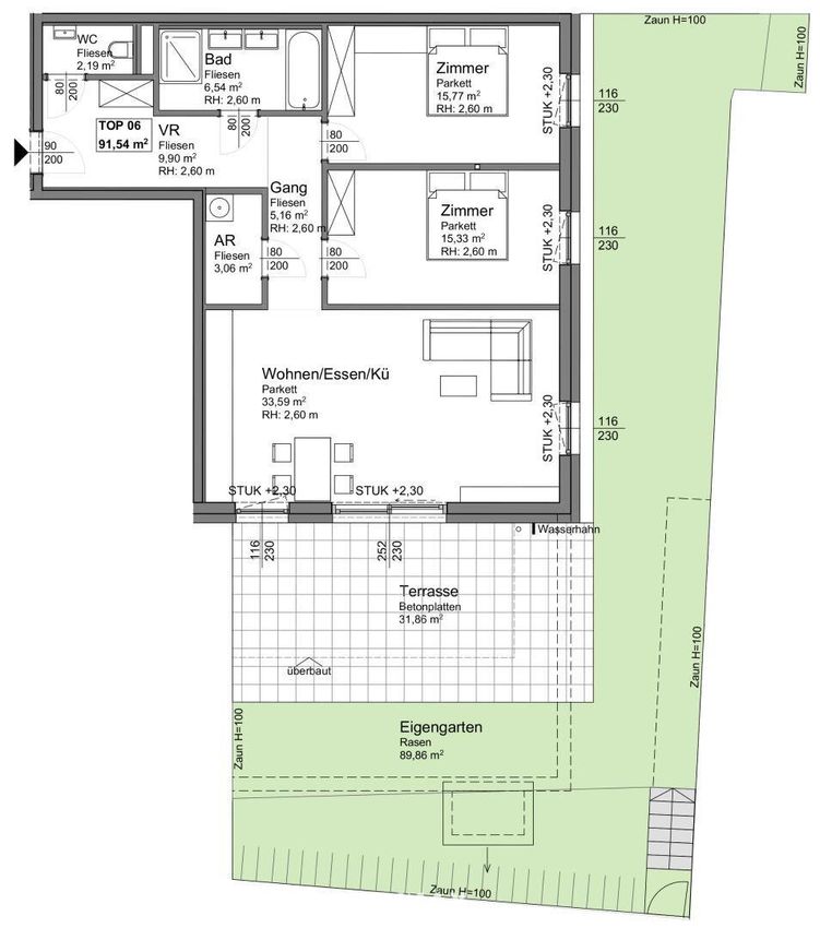 Top 6 ist eine großzügige 3-Zimmer-Wohnung im Erdgeschoss, die mit einem großen Garten und einer großzügigen Terrasse punktet. Der offene Wohn-Küchenbereich schafft eine moderne und lichtdurchflutete Atmosphäre. Mit einer attraktiven Ost-West-Ausrichtung profitieren Sie von optimaler Belichtung. Das Badezimmer ist mit sowohl einer Dusche als auch einer Badewanne ausgestattet, das WC ist separat. Ein Abstellraum mit Waschmaschinenanschluss bietet praktischen Stauraum.