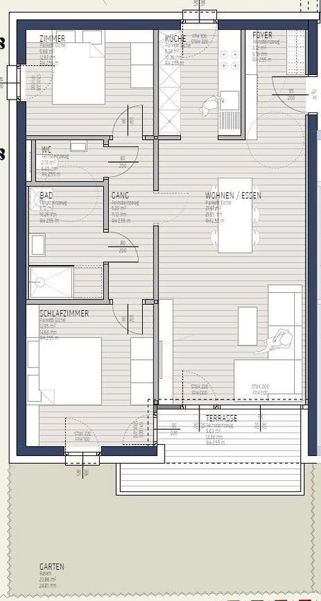 Die Wohnungen sind ideal für Paare und kleine Familien konzipiert. Der Vorraum bietet ausreichend Platz für eine Garderobe und führt direkt in den offenen Wohn- und Essbereich. Das Badezimmer und das separate WC sind großzügig geplant; auf Wunsch kann die Trennwand zwischen beiden entfernt werden. Die Küche bietet Raum für zwei Küchenzeilen und kann – je nach Bedarf – offen zum Wohnraum hin gestaltet werden. Hochwertige Materialien wie Feinsteinzeug oder Parkett im Küchenbereich sowie ein eleganter Eichenklebeparkett im Wohnraum unterstreichen die Qualität. Ein bodentiefes Fenster und eine Balkontür sorgt für einen hellen Wohnraum und direkten Zugang zur Terrasse oder Loggia.