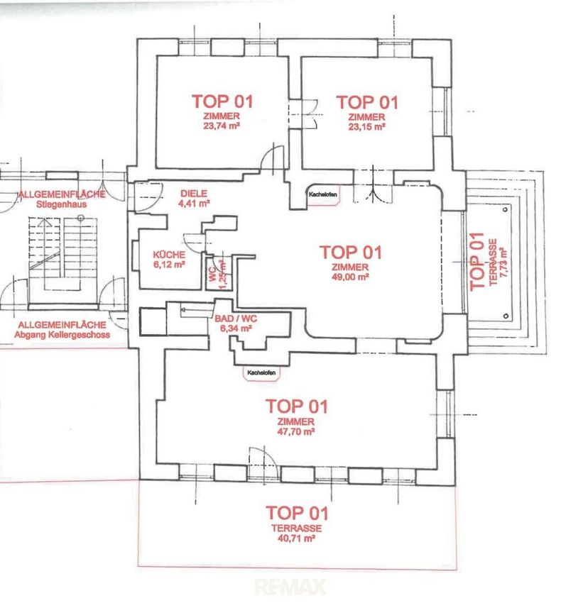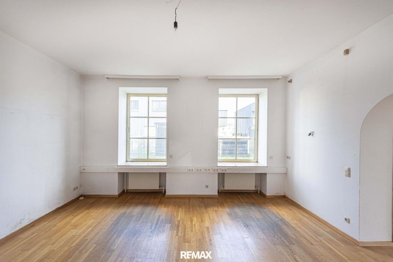 Aufgrund der langjährigen Nutzung als Büro verfügt dieses Geschoss über 4 Zimmer, Teeküche und Toilette - für Wohnzwecke ist eine dementsprechende Adaptierung des neuen Eigentümers erforderlich. Eine denkbare Umsetzung liegt bereits mit den Plänen des Architekten vor.